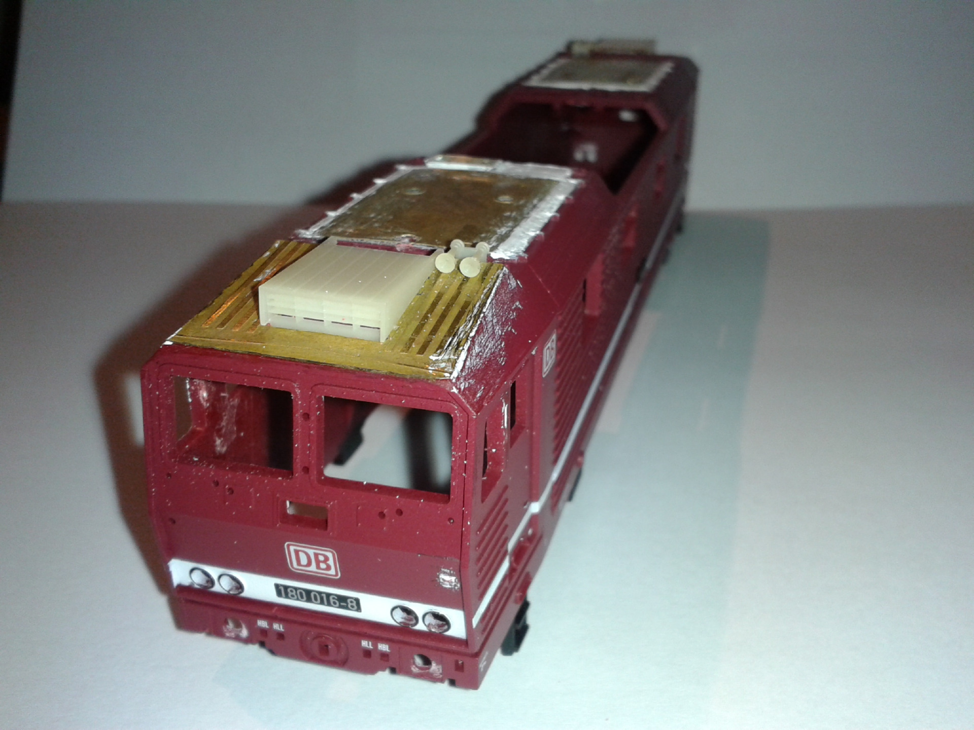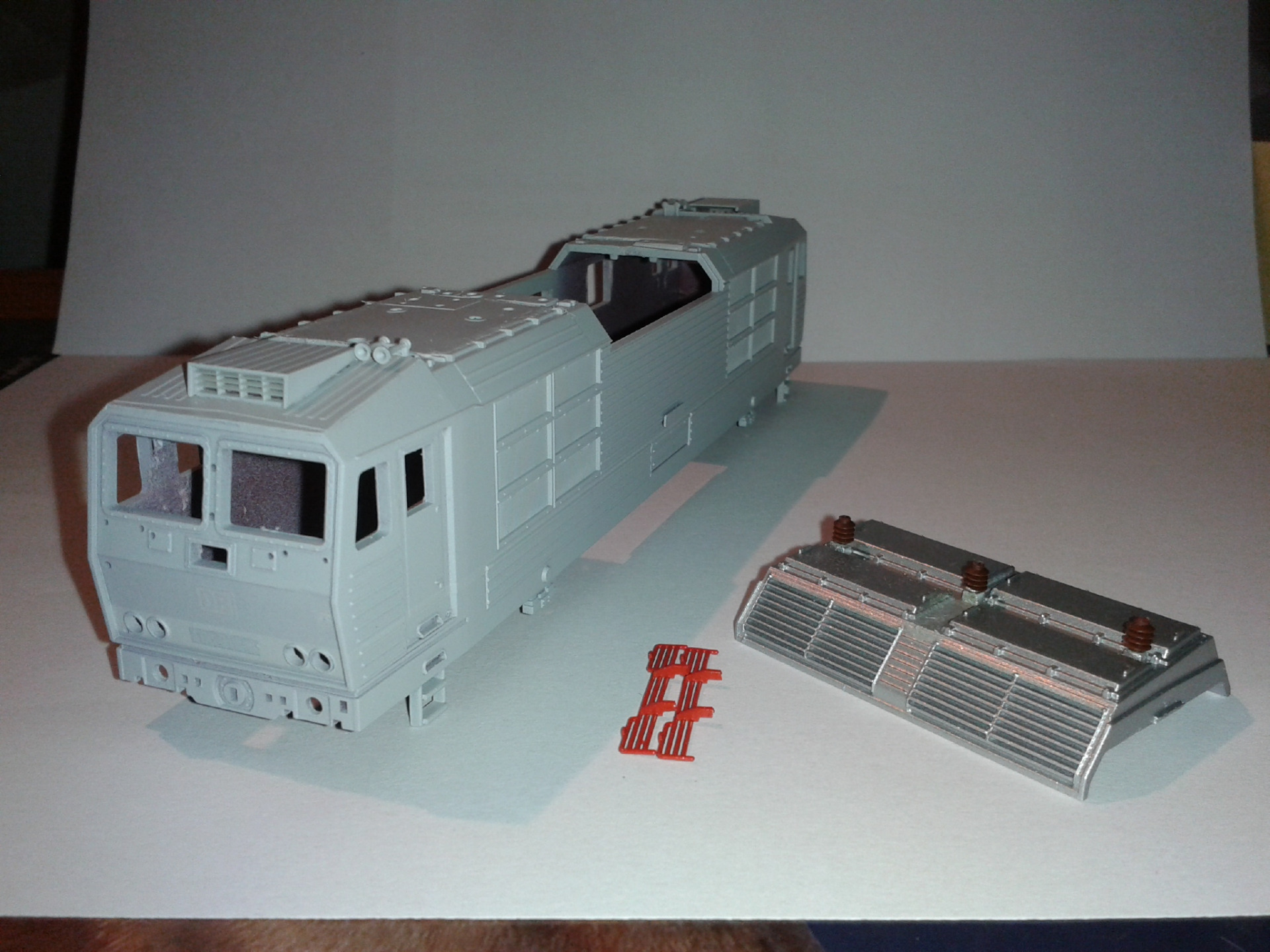 Následovalo vybroušení střešních partií - odstranění nevhodně umístěných prolisů a větrání, a na části pod sběrači odstranění (odfrézování) všeho, co je navíc. Poté jsem nalepil leptaný doplněk s novými prolisy a taky doplnil klimatizaci.