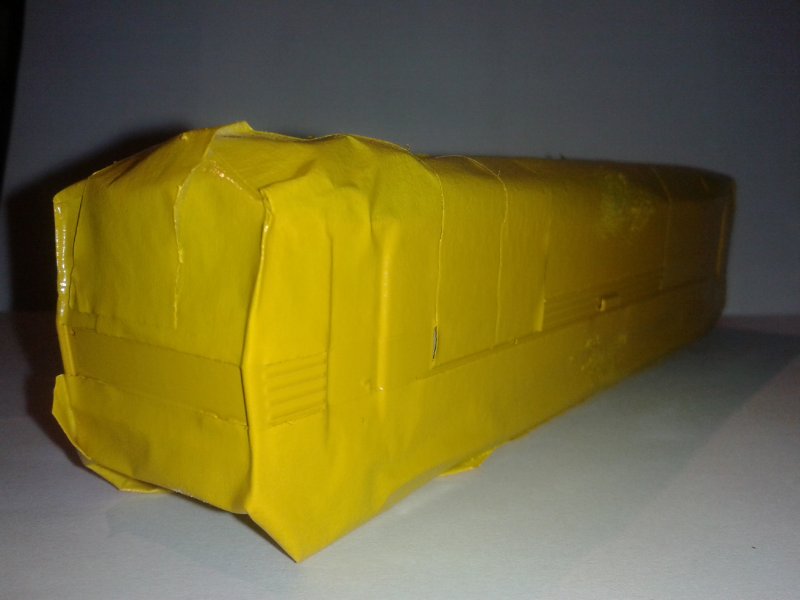 Zamaskoval jsem červenou část a nastříkal žlutý pruh. První žlutá velmi špatně kryla, tak jsem použil RAL 1003. Asi toho je víc vrstev, než je zdrávo. Budu muste najít nějaké řešení jak z této situace ven ...